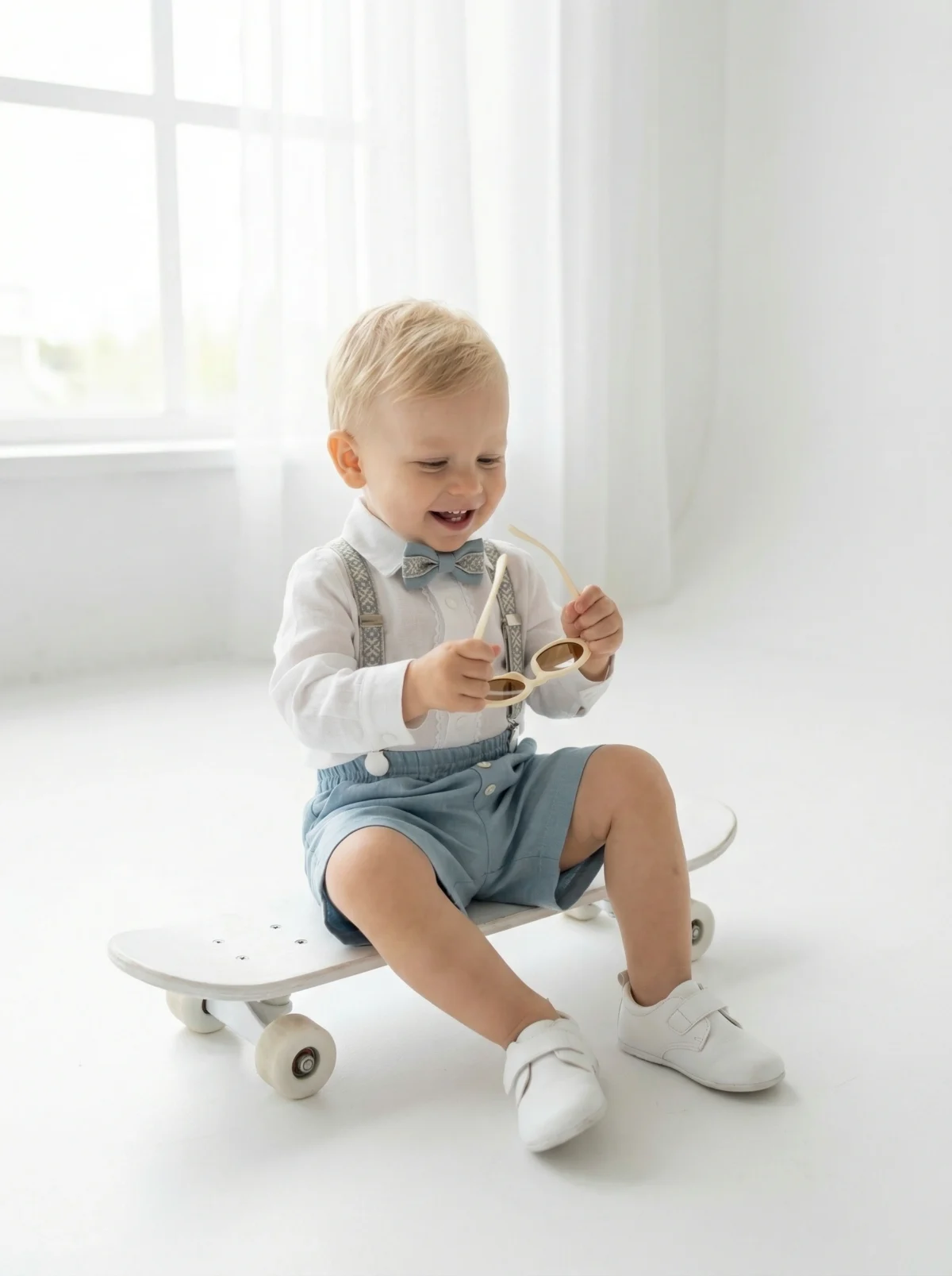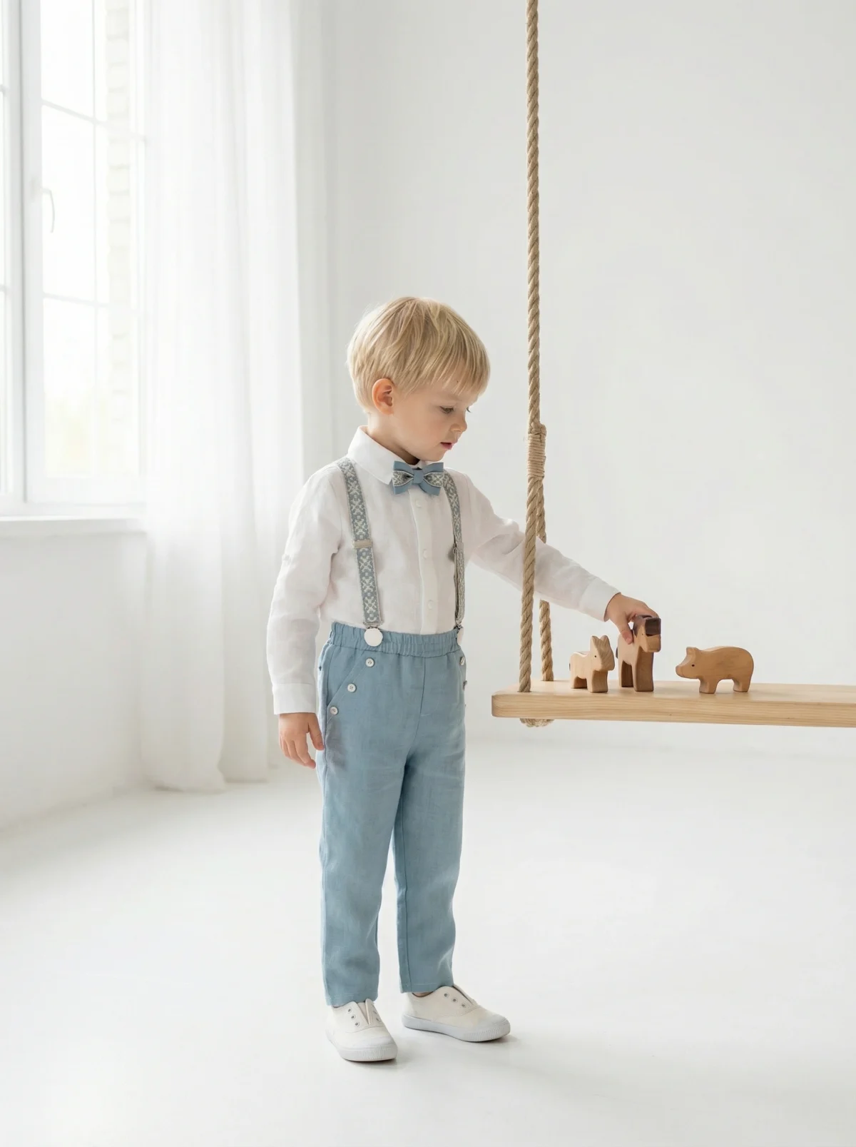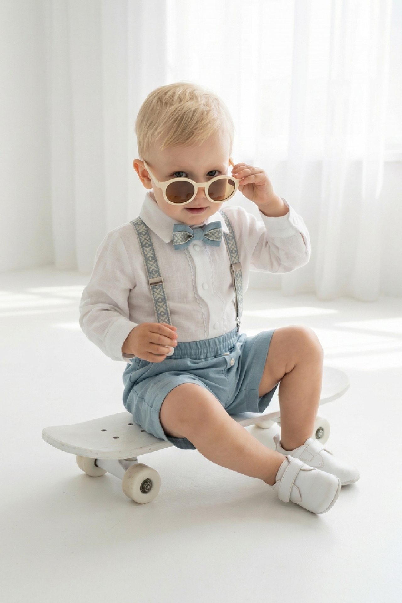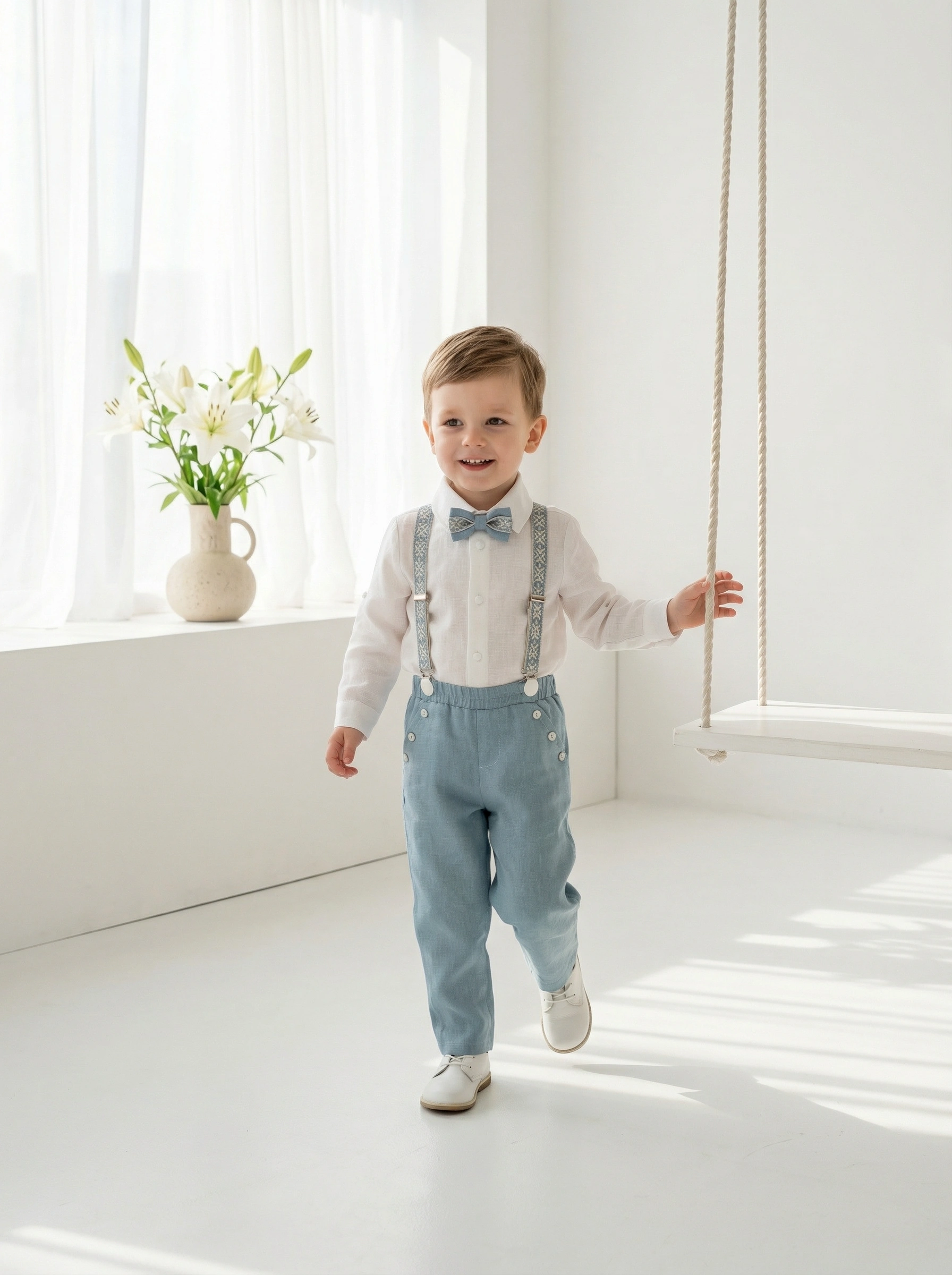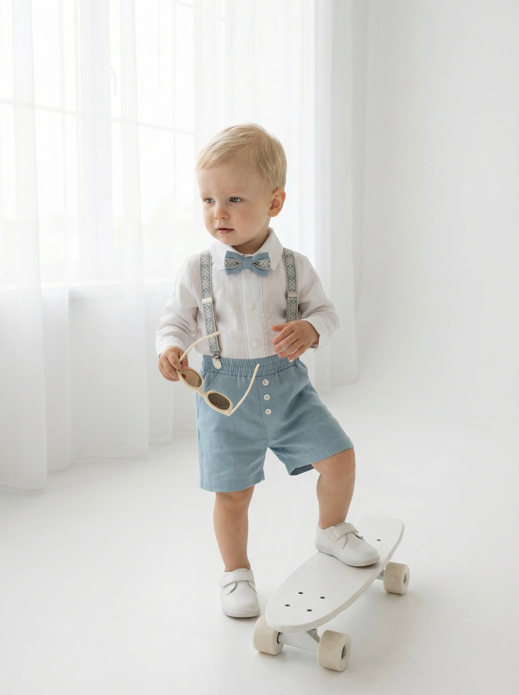 4 dalys ( kelnės arba šortai, marškiniai, petnešos, peteliškė)